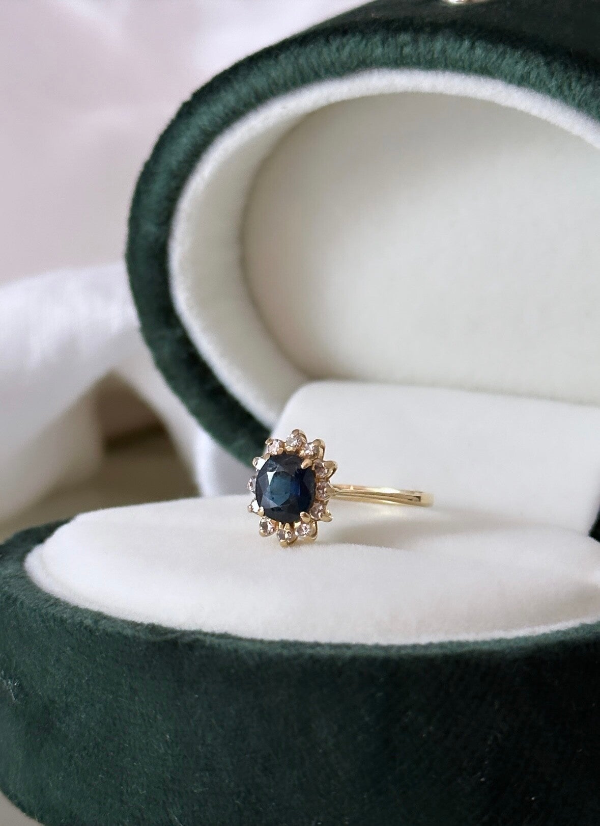 The Sapphire & Diamond Cluster Ring is just incredible! She is made of 18 carat gold inlaid with a beautiful Sapphire gemstone surrounded by sparkling Diamonds.