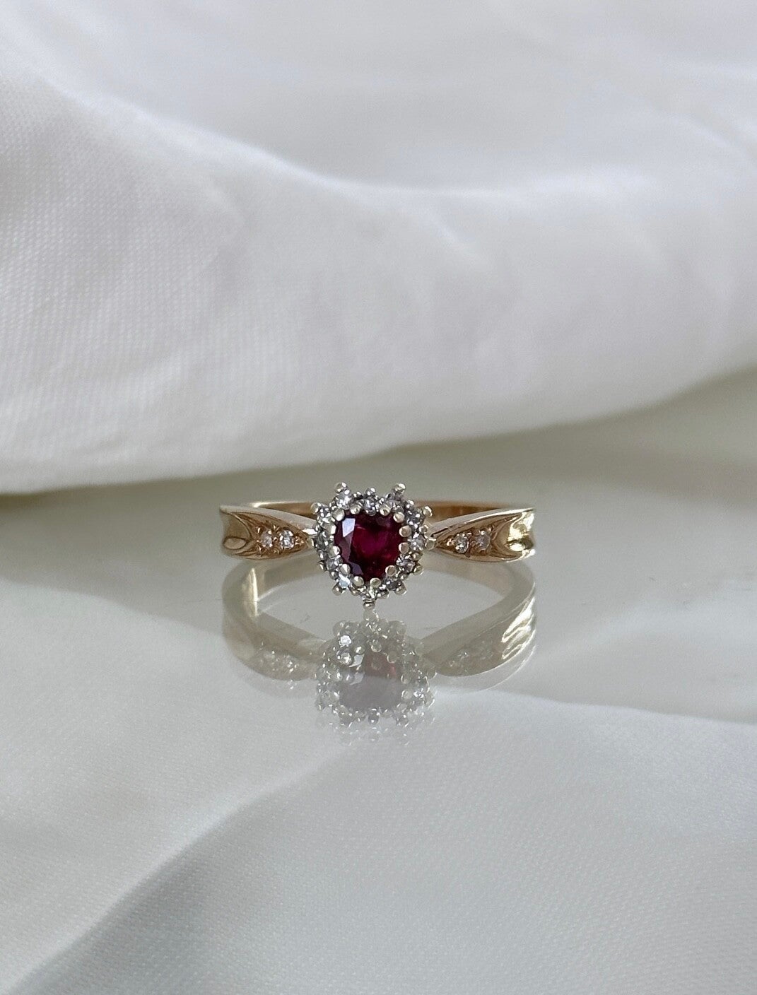 The Diamond & Ruby heart ring is made of 9 carat gold inlaid with a beautiful bright pink Ruby gemstone surrounded by sparkling Diamonds.