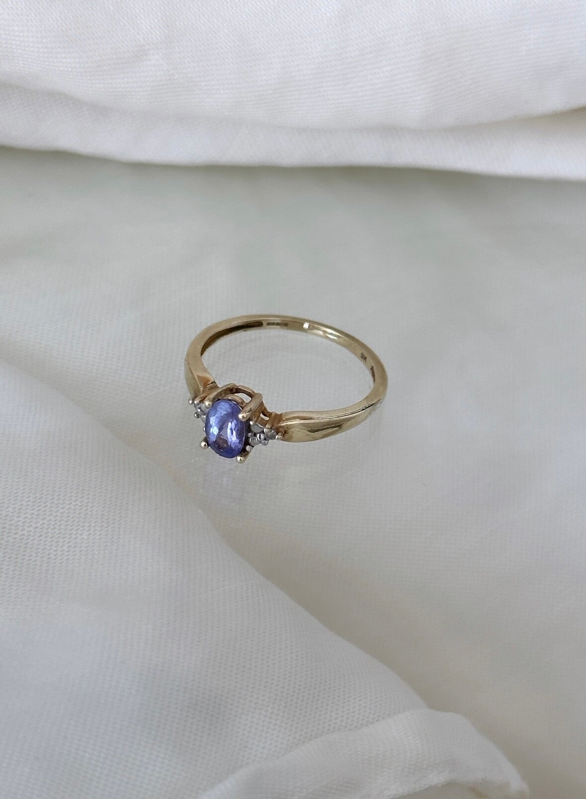 A beautiful ring of 9 carat gold inlaid with bright purple Tanzanite gemstone. There are diamonds on both sides.