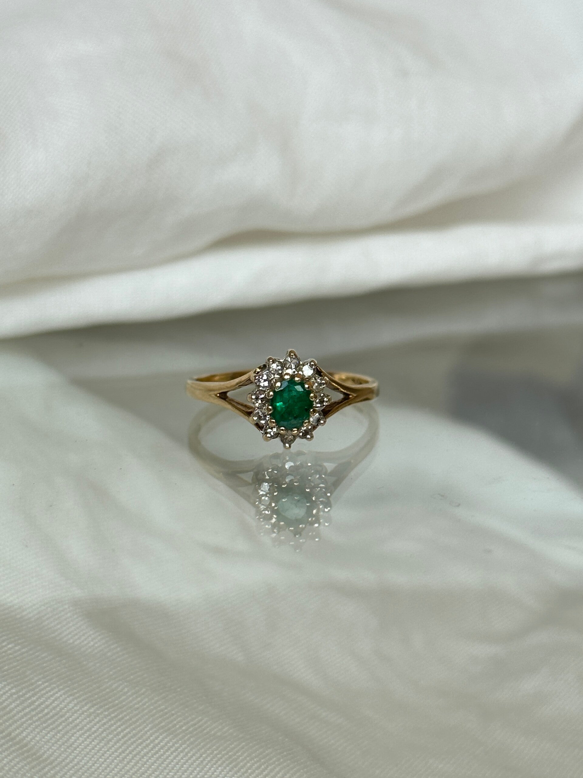 Embrace eternal love with our Emerald & Diamond ring. She is made of 9 carat gold inlaid with a beautiful Emerald gemstone surrounded by tiny Diamonds. 9ct