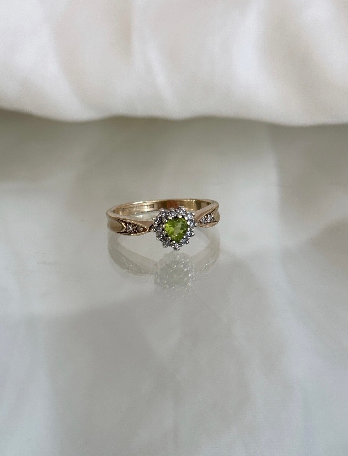 The Peridot & diamond heart ring is made of 9-carat gold inlaid with a beautiful bright green Peridot gemstone surrounded by sparkling Diamonds.