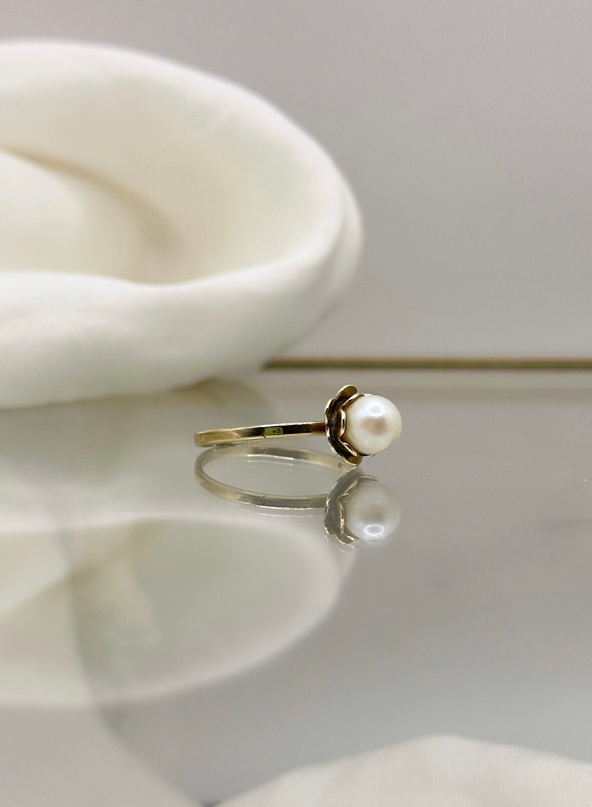 The Vintage pearl ring is made of 8-carat gold inlaid with a beautiful pearl. Wear her alone as a shimmering beauty, or stack with other treasures.