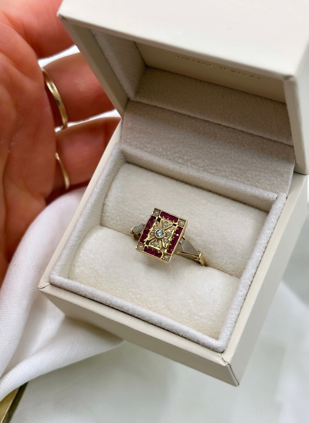 This beautiful ring is made of 14-carat bicolor gold inlaid with beautiful ruby's seed pearl, and cubic zirconia. Such a dream!