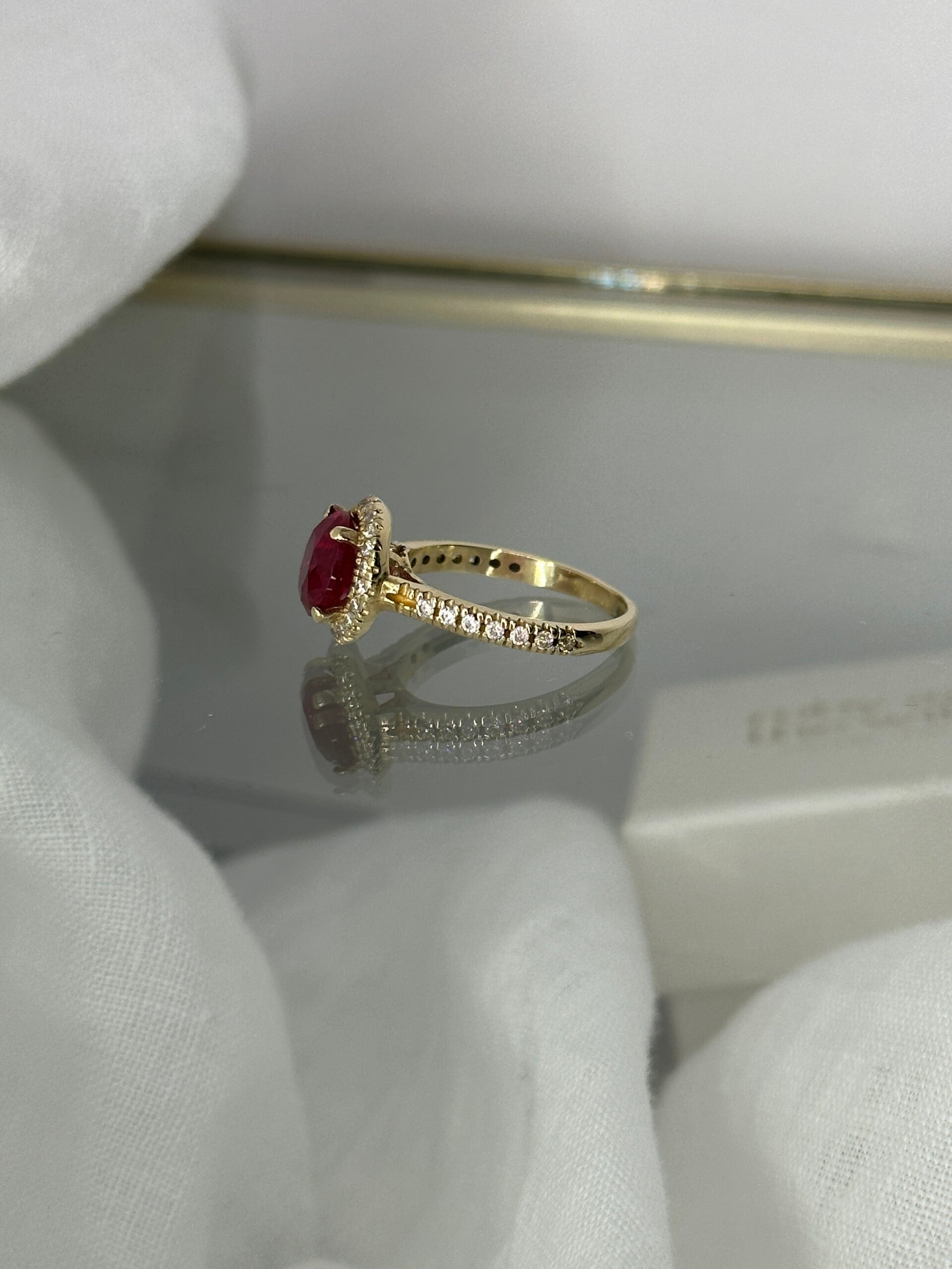 The vintage halo ring is crafted from 14-carat vintage gold, inlaid with Cubic Zirconia and a beautiful synthetic ruby stone. Such an eyecatcher!