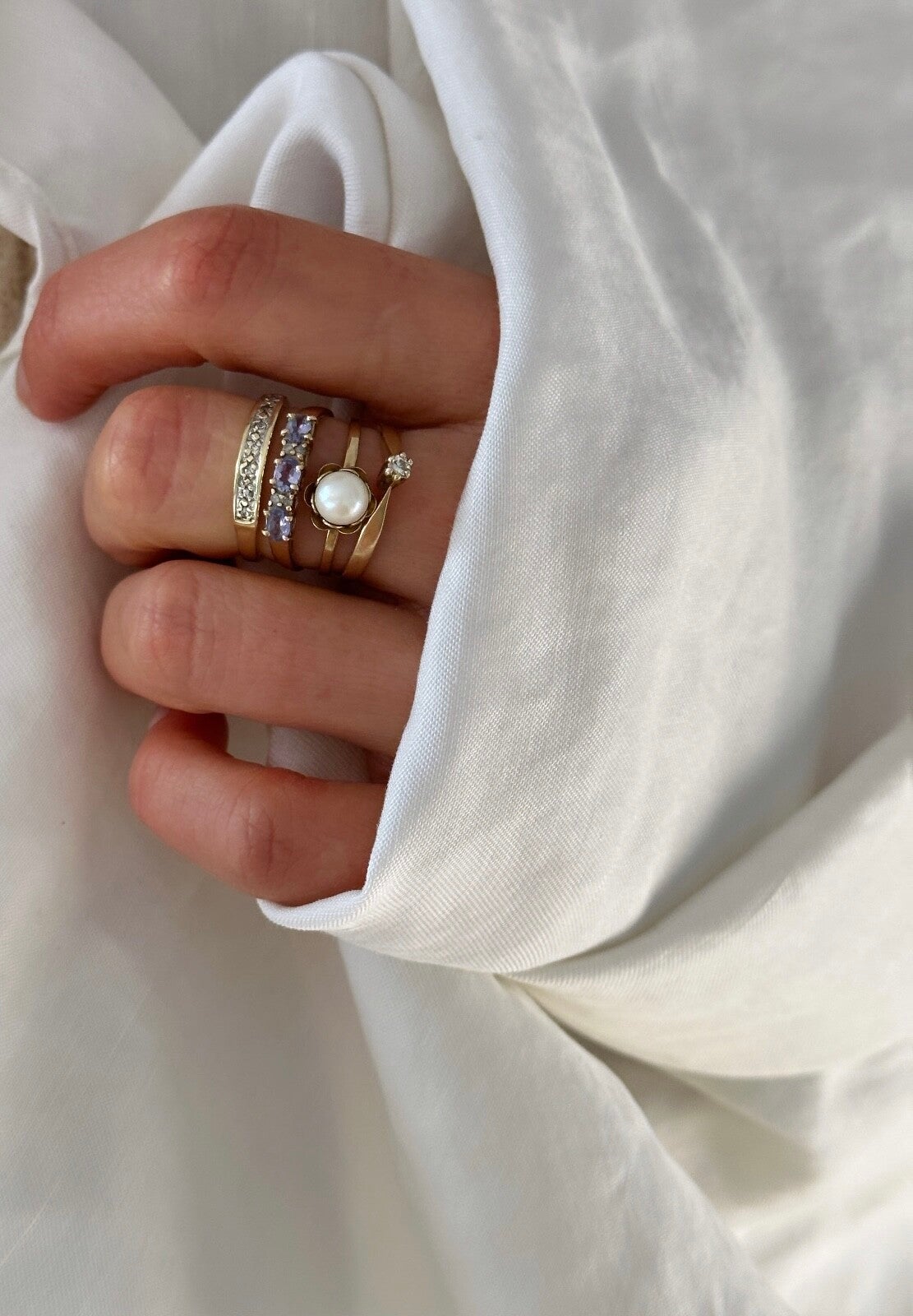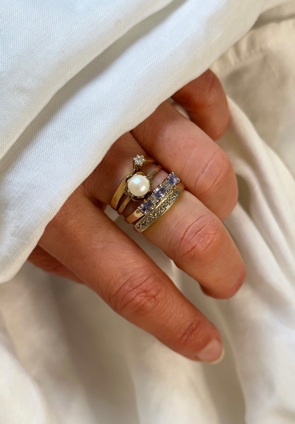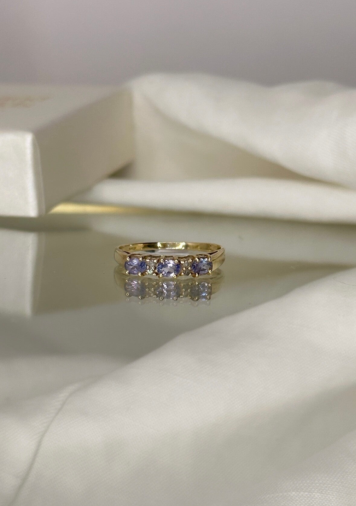 A beautiful ring of 9 carat gold inlaid with bright purple Tanzanite gemstones and diamonds in between.