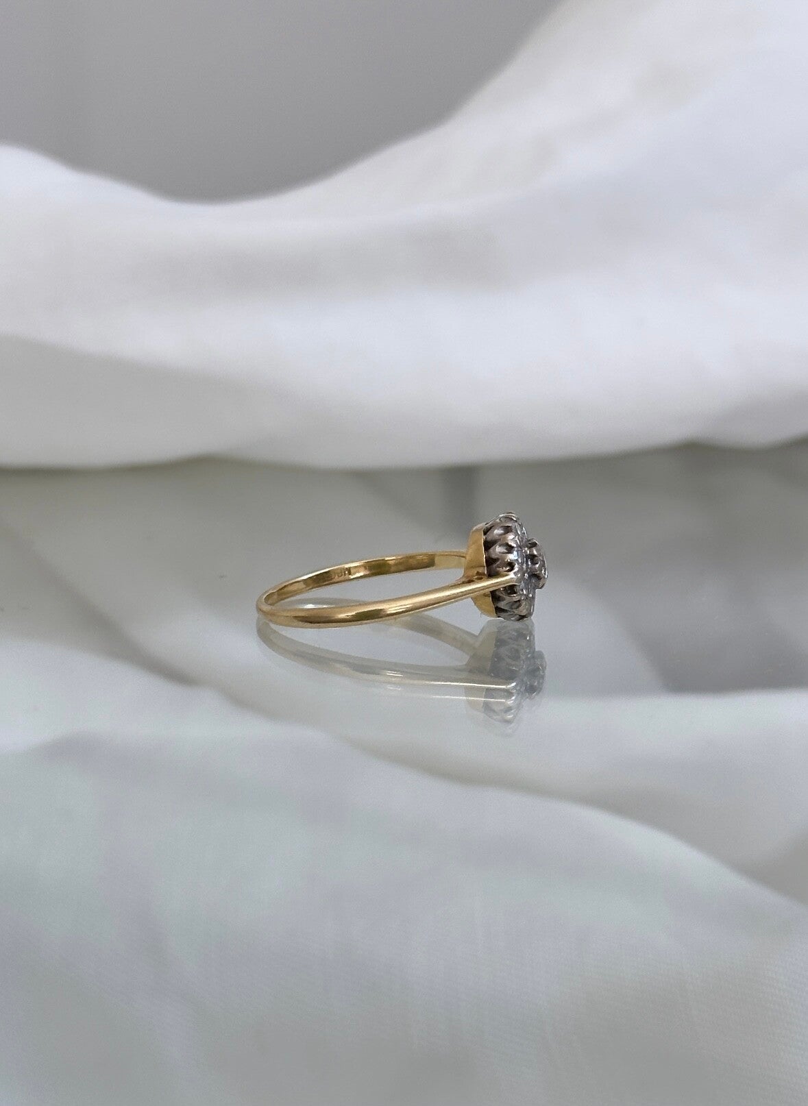 What a dream! The antique Diamond Cluster ring. She is made of 18ct gold with nine round cut Diamonds in a platinum setting and the band of the ring in yellow gold.