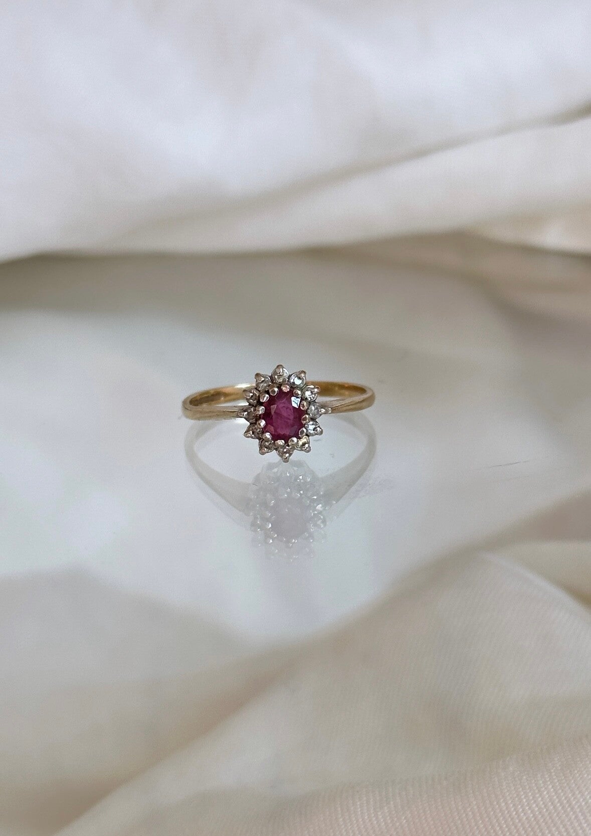 The Ruby & Diamond ring is made of 9-carat gold inlaid with a bright pink ruby gemstone surrounded by sparkling Diamonds. Such a beauty!