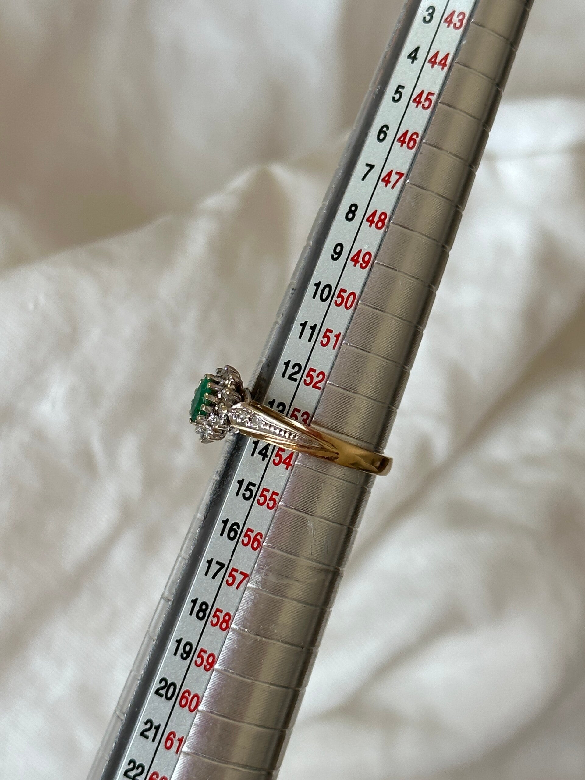 Fall in love with this beautiful ring, set in gold and featuring an Emerald gemstone embraced by Diamonds. Small diamonds are on each side. It is a treasure to love forever.