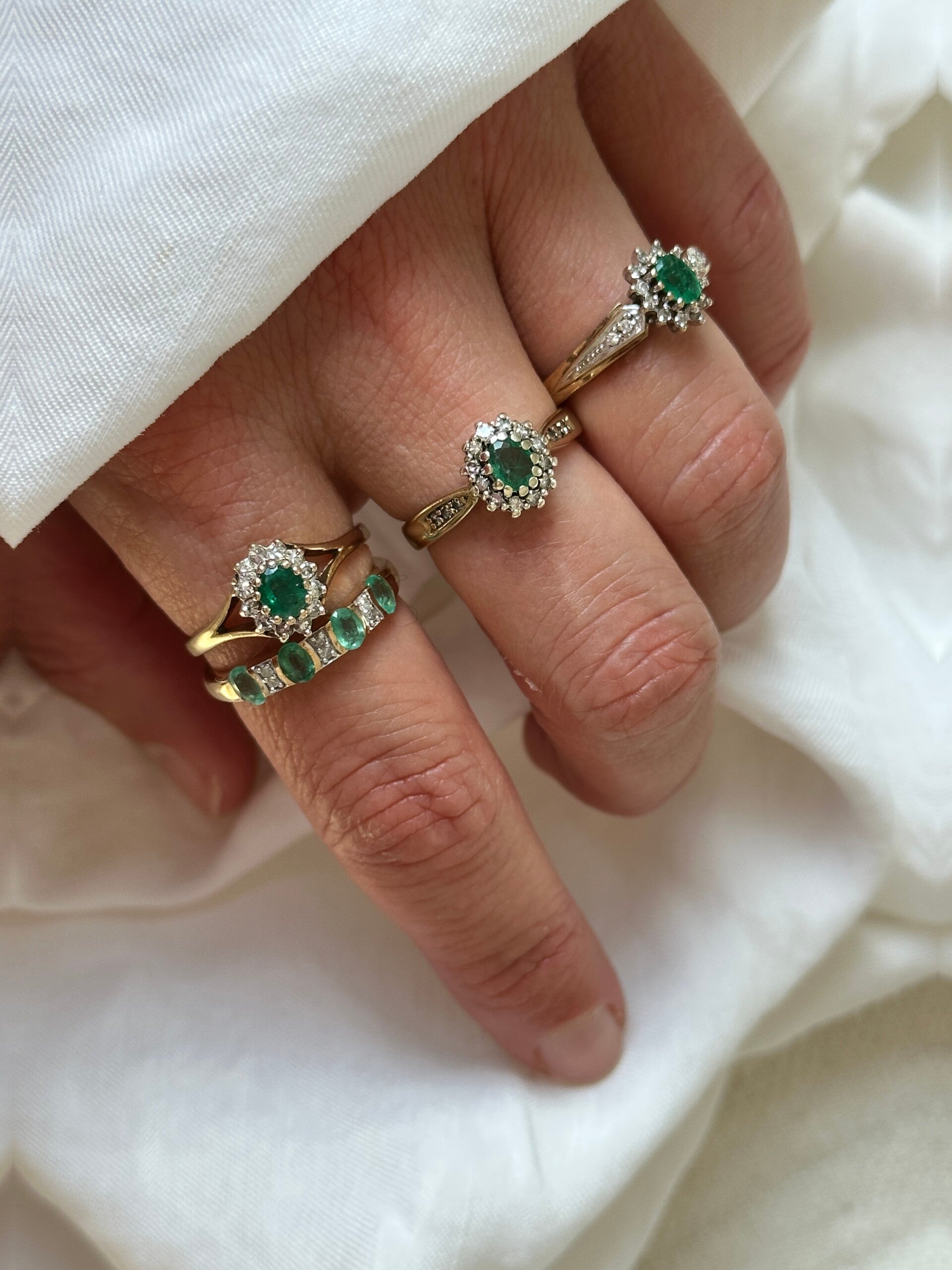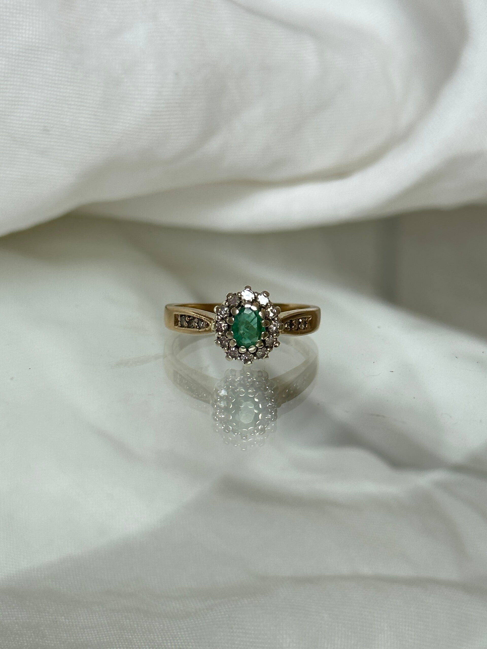 Fall in love with this beautiful ring, set in gold and featuring an Emerald gemstone embraced by Diamonds. Small diamonds are on each side. It is a treasure to love forever.