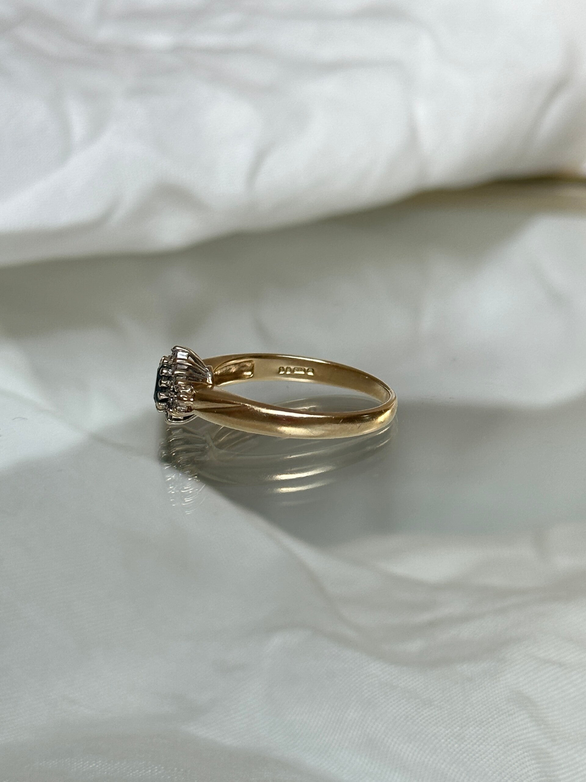 A beautiful Topaz and Diamond cluster ring in 9-carat yellow gold. The ring is inlaid with a bright blue Topaz gemstone and surrounded by sparkling diamonds.