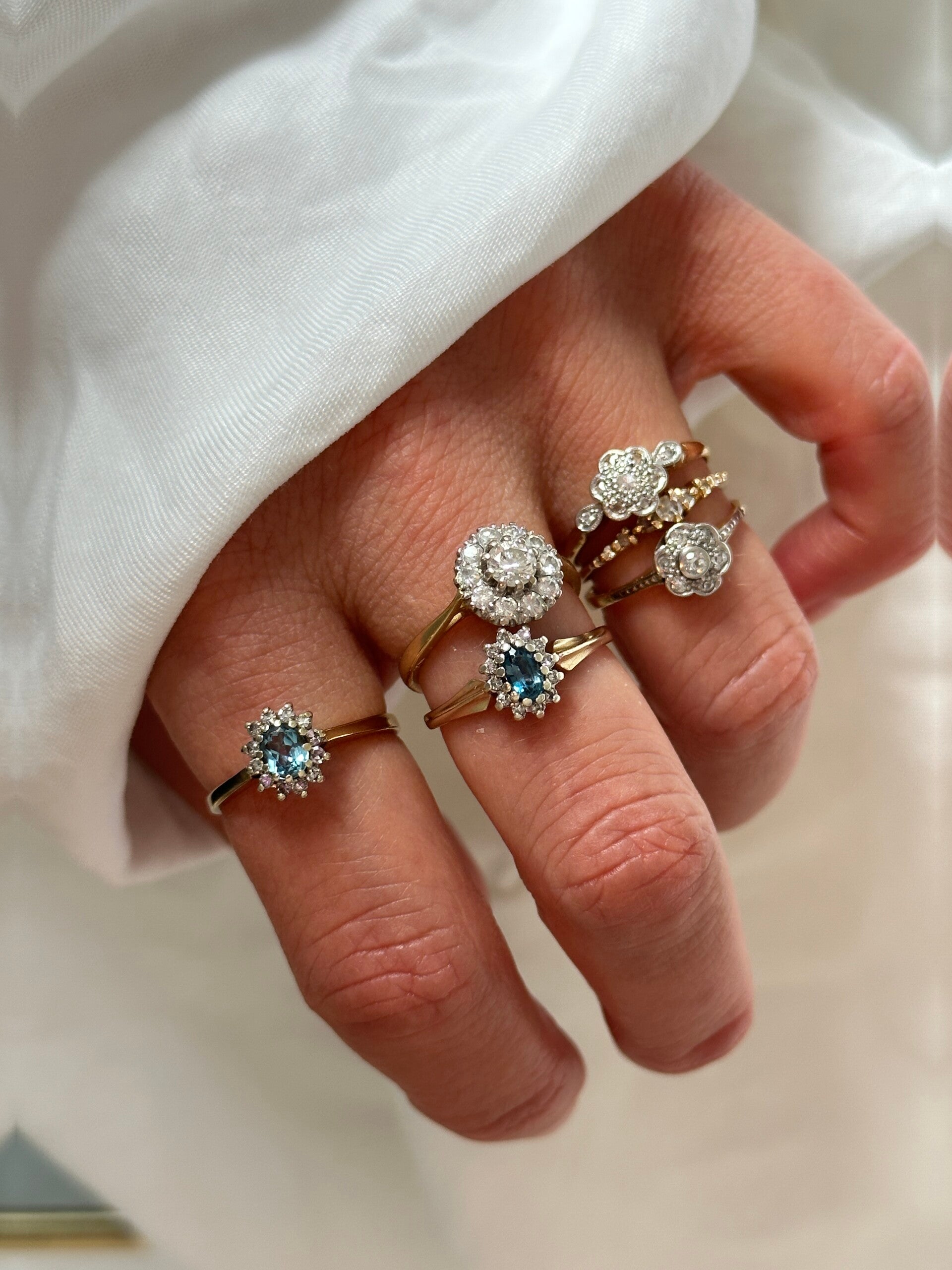 Art Deco Daisy Diamond Cluster ring (2013) What a beauty. She is made of 18ct yellow gold with a platinum top with seven round cut diamonds. The sholders are accented with platinum details, each with a single diamond.