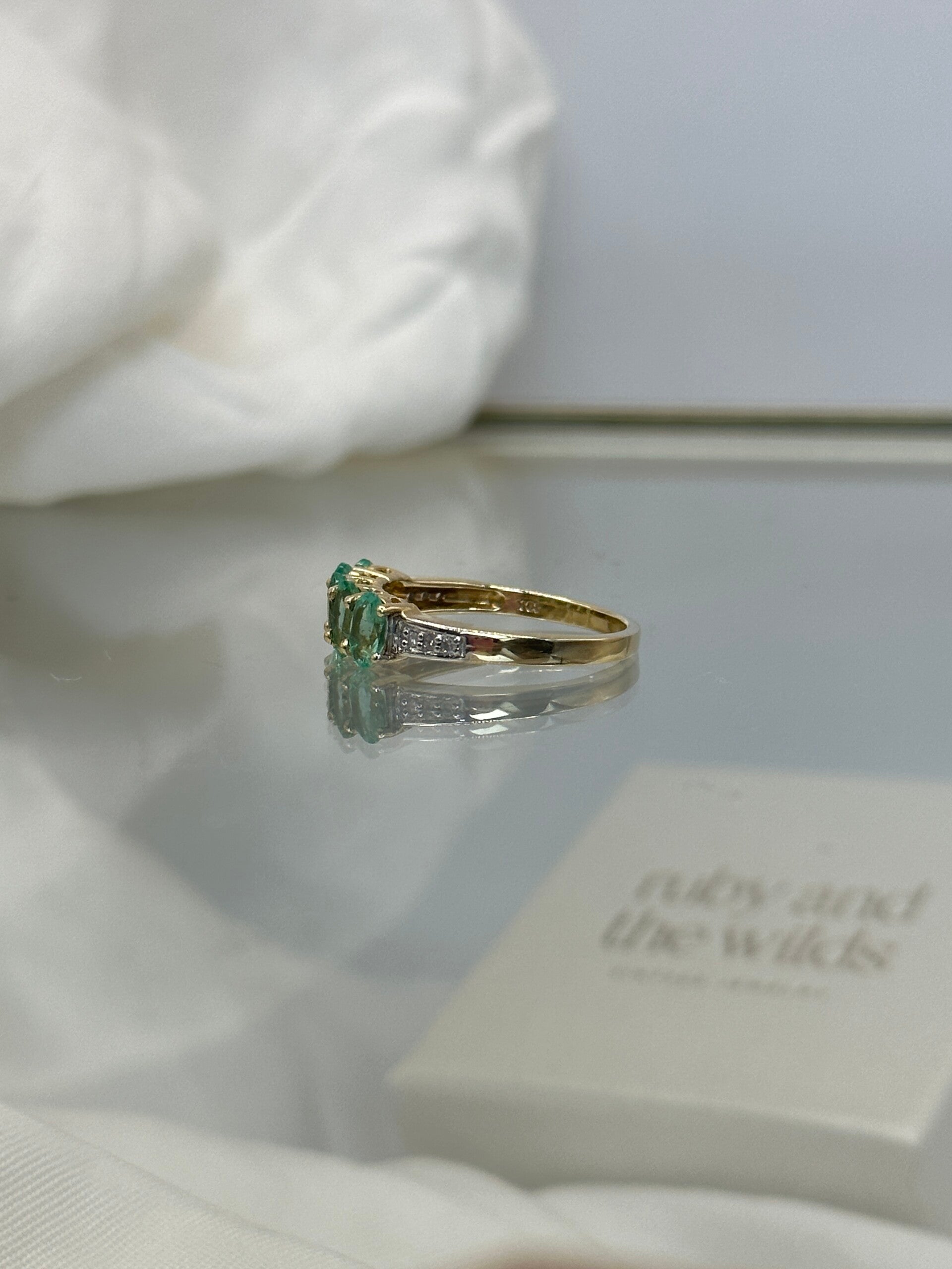 What a beauty! The ring is made of 9-carat yellow gold inlaid with five beautiful, bright green emerald gemstones (5 x 3mm) . There are three small round diamonds on each shoulder. We are in love!