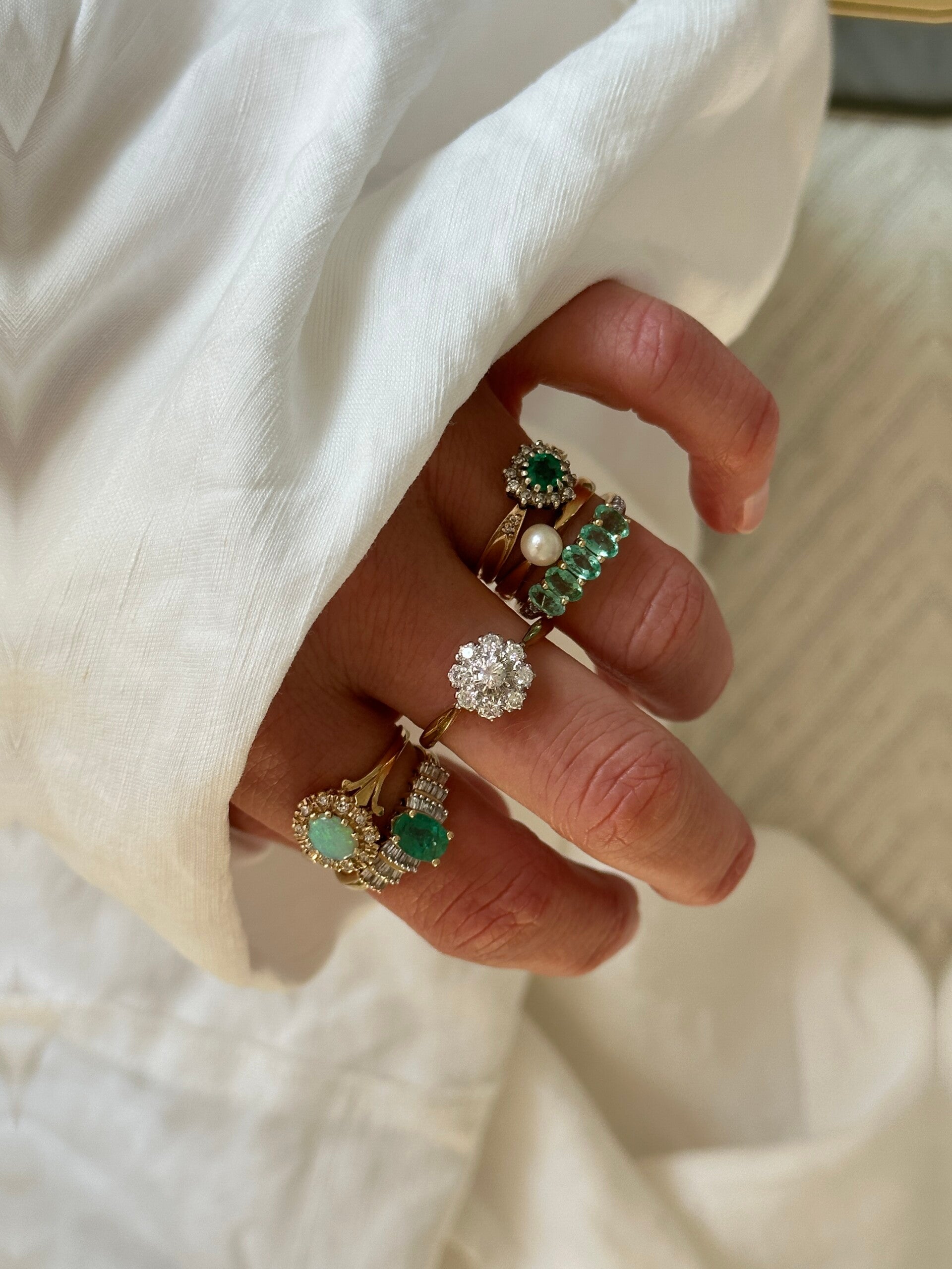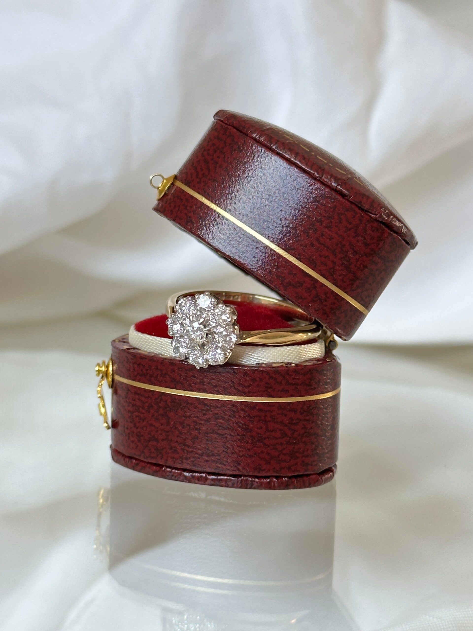 This Daisy Diamond Cluster ring is so beautiful! She is made of 18ct gold with nine round-cut Diamonds in a platinum setting. The band of the ring is in yellow gold. What a dream!