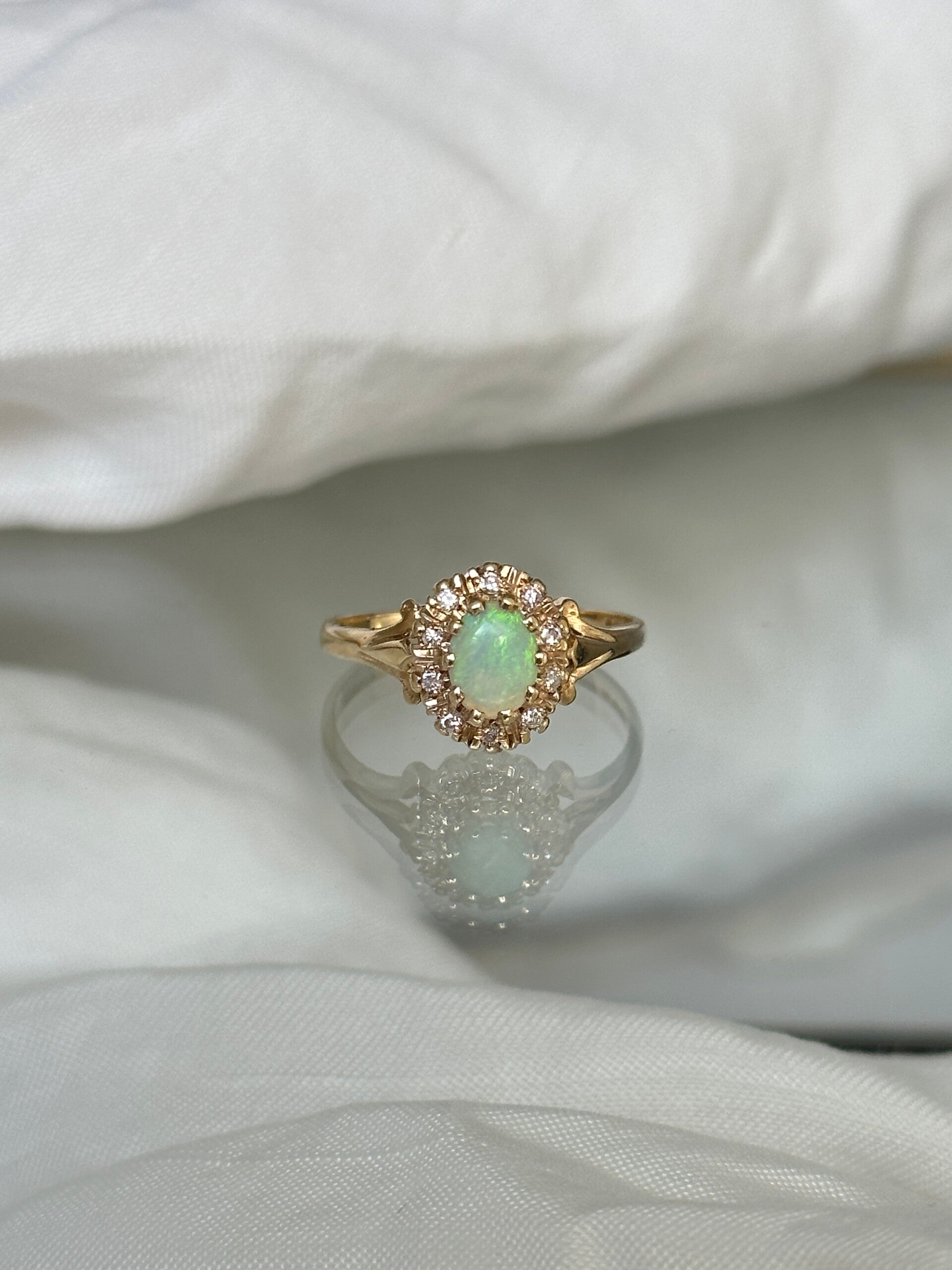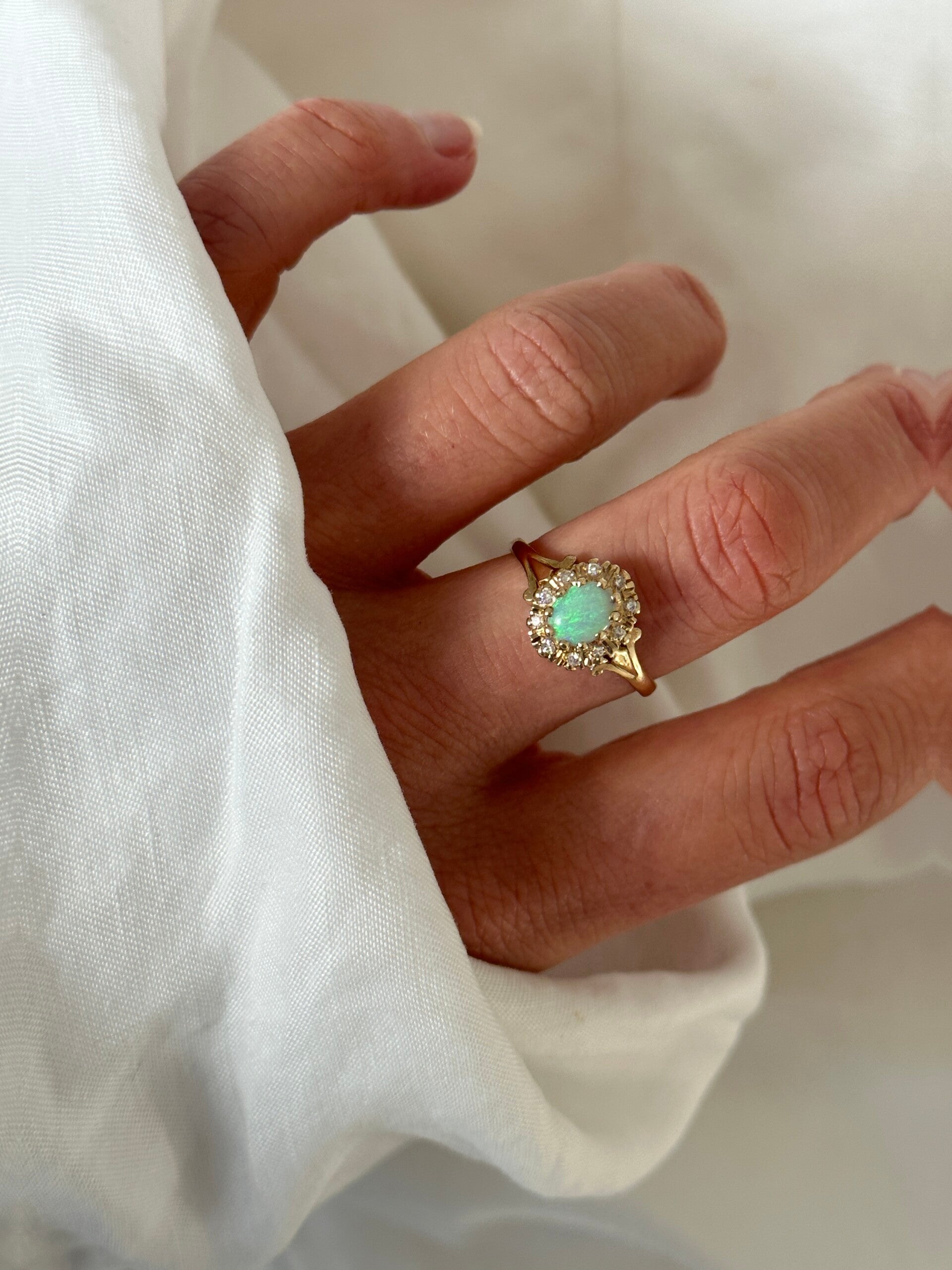 A gorgeous and dreamy vintage 9ct gold opal and diamond cluster ring. This beautiful piece from the 1980s features a dreamy oval-cut opal at the centre, displaying beautiful flashes of blue, green, and soft pink. The opal is surrounded by sparking diamonds.