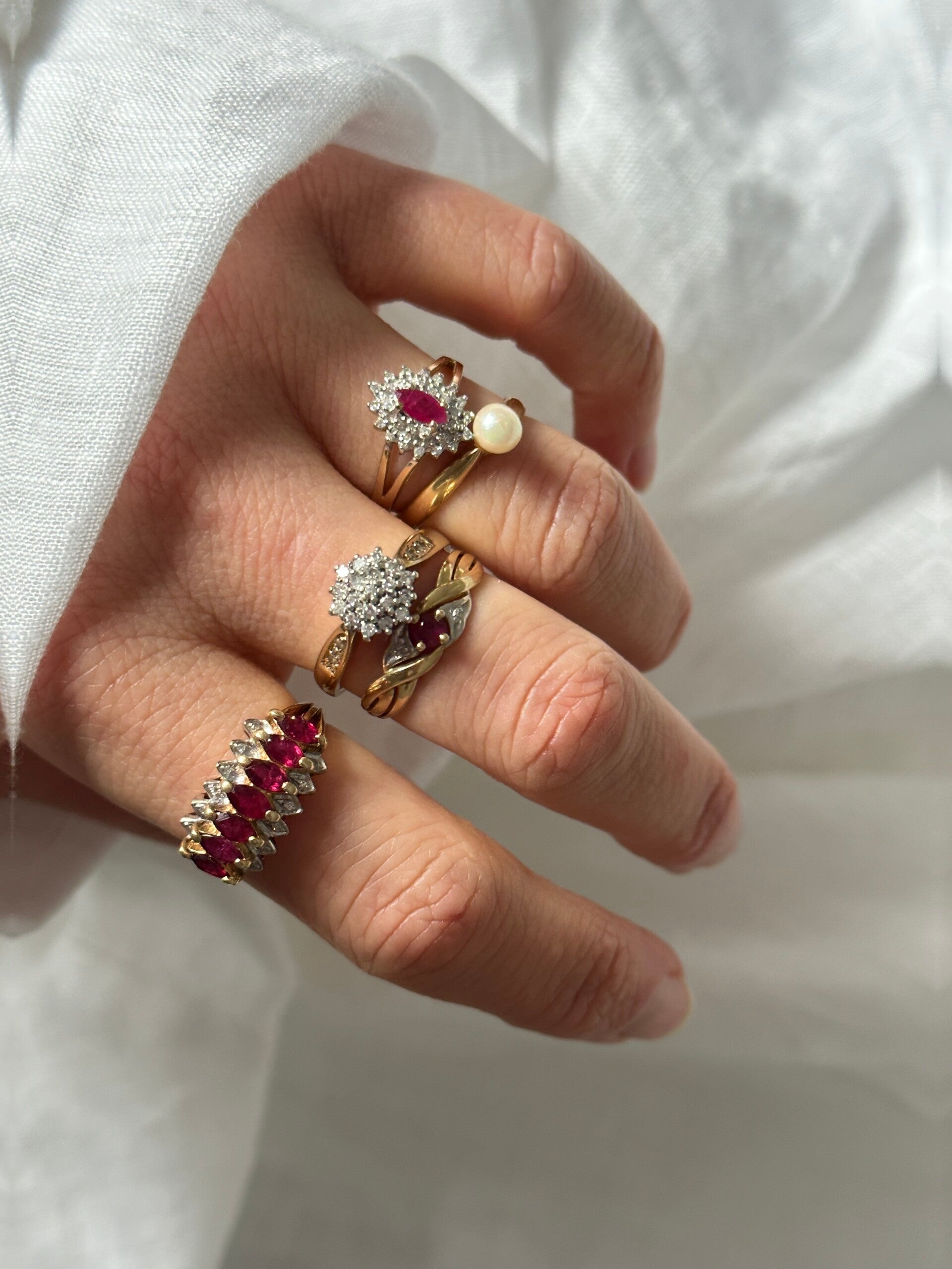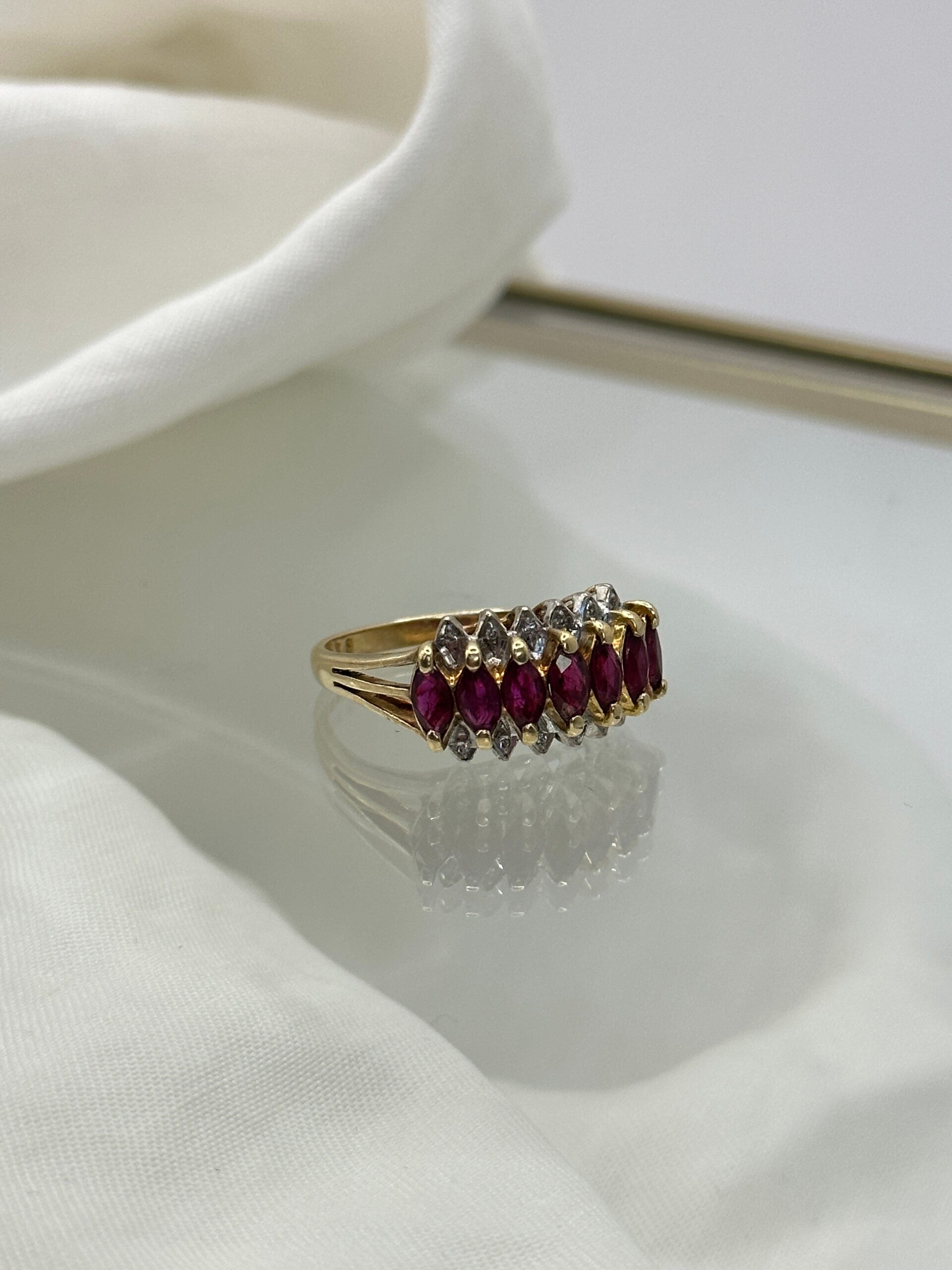 Cherish your love and dreams with this one-of-a-kind Ruby and Diamond ring in 14-carat gold—such an eyecatcher! The ring features seven rubies and twelve tiny diamonds.