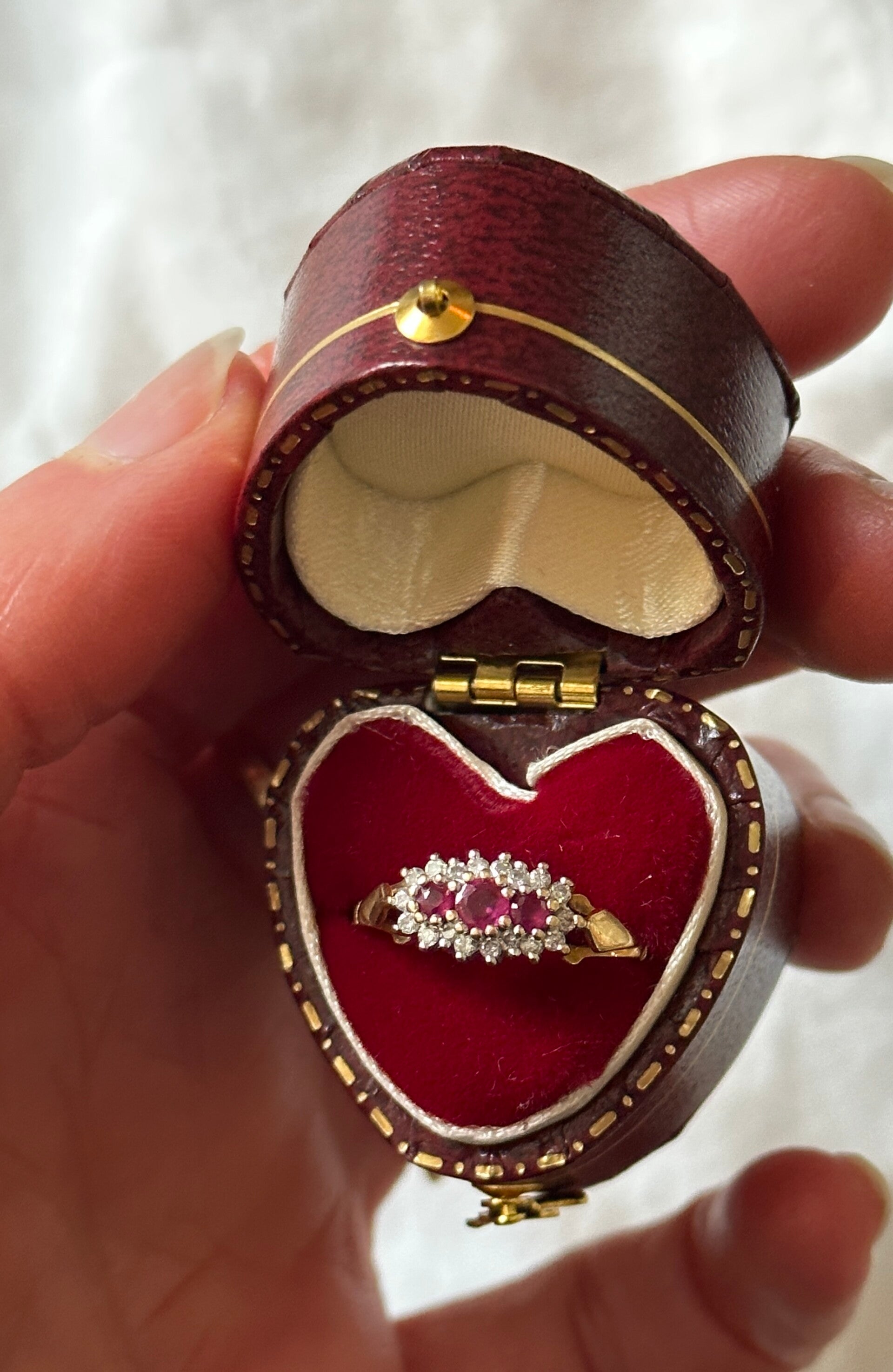 Cherish your love and dreams with this one-of-a-kind Ruby and Diamond ring, which is truly beautiful! She is made of 18-carat gold. The ring is inlaid with three round rubies with a cluster of diamonds. What a dream!