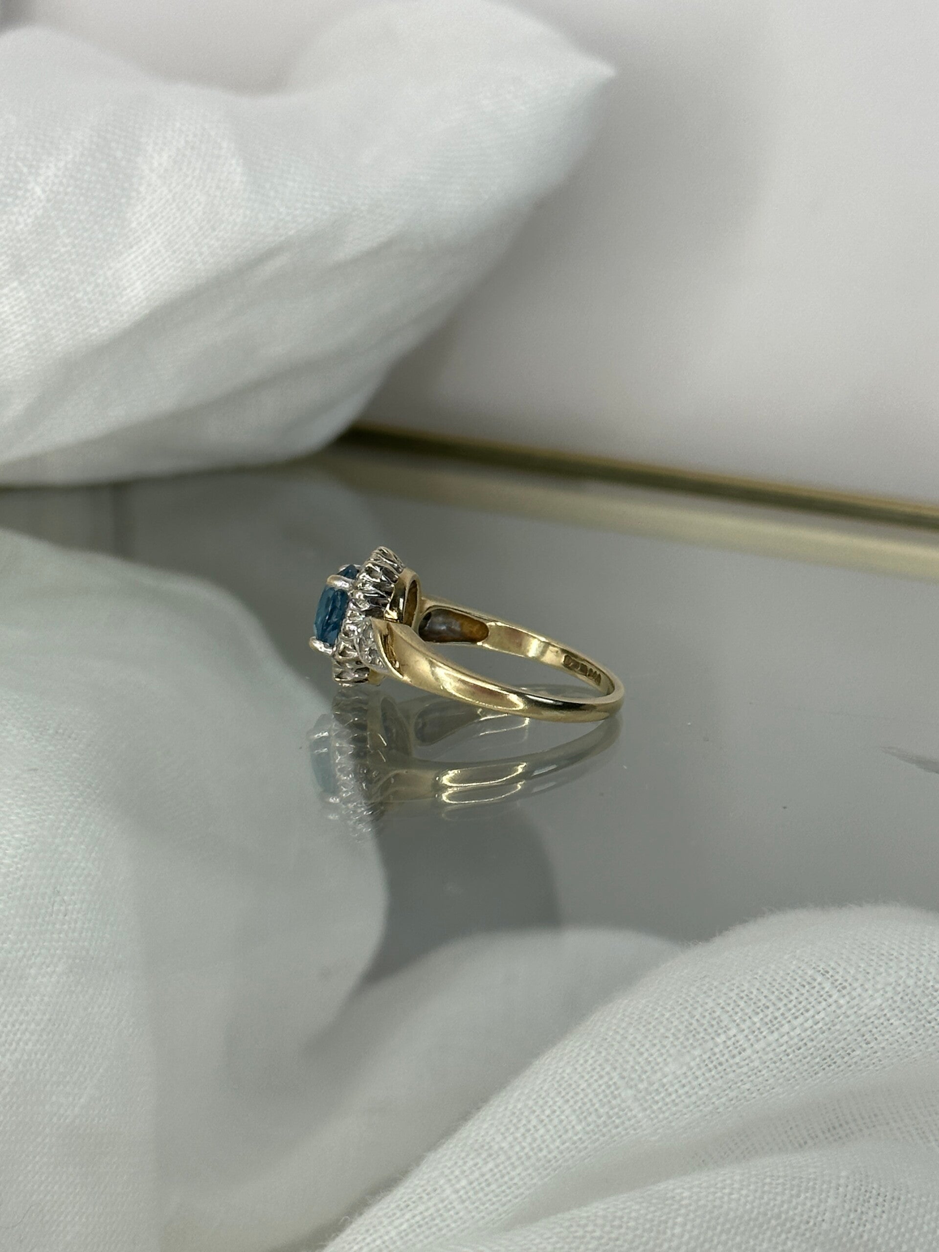 The ring features a 7 x 5mm oval topaz with a cluster of small six round-cut diamonds. With three diamonds on each shoulder of the ring. A forever treasure.