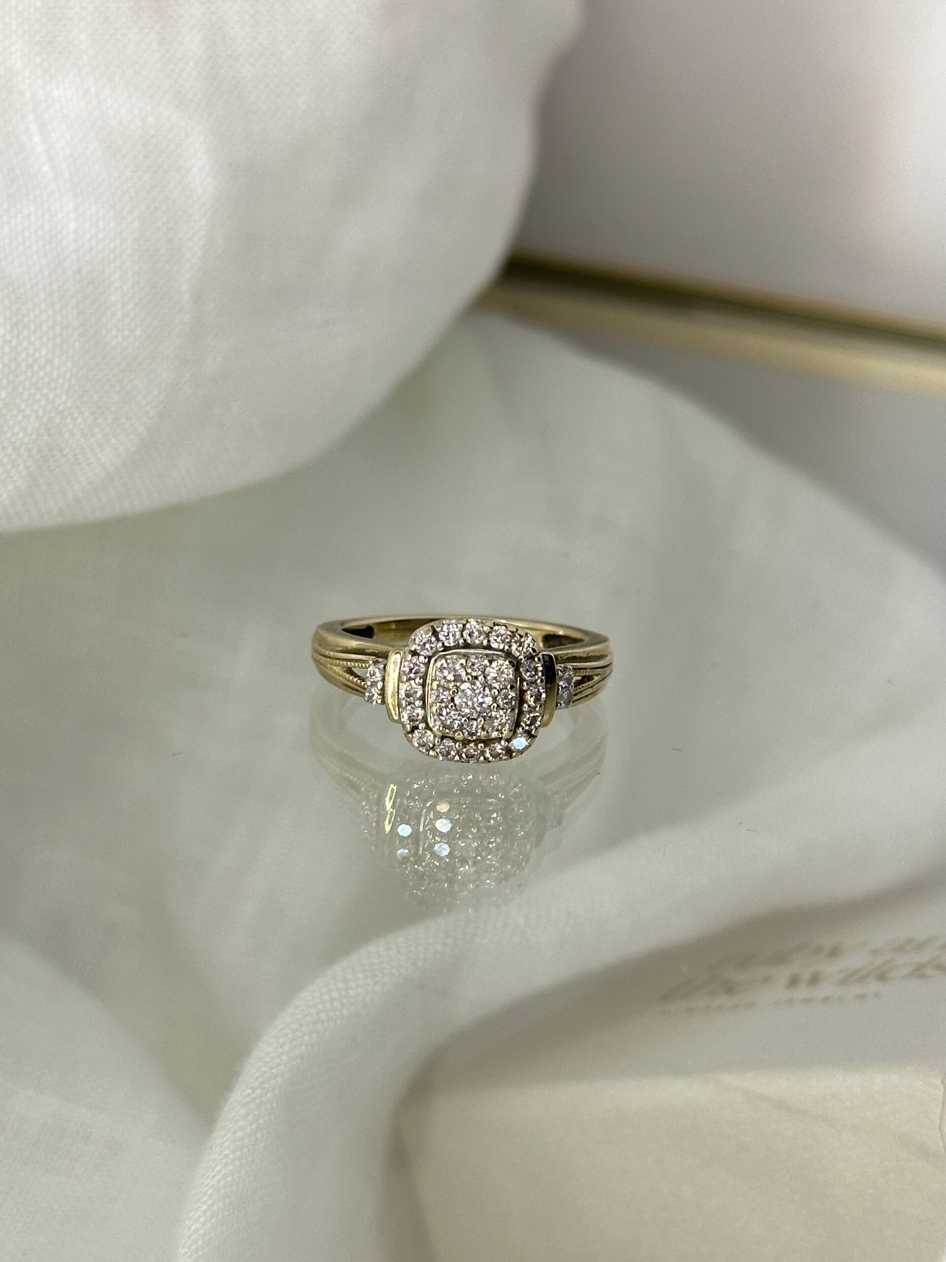 Cherish your love and dreams with this one-of-a-kind Diamond ring, which is truly beautiful! She is made of 9-carat gold. The ring is inlaid with beautiful round-cut natural earth-mined diamonds. There are two diamonds on each shoulder of the ring. What a dream!