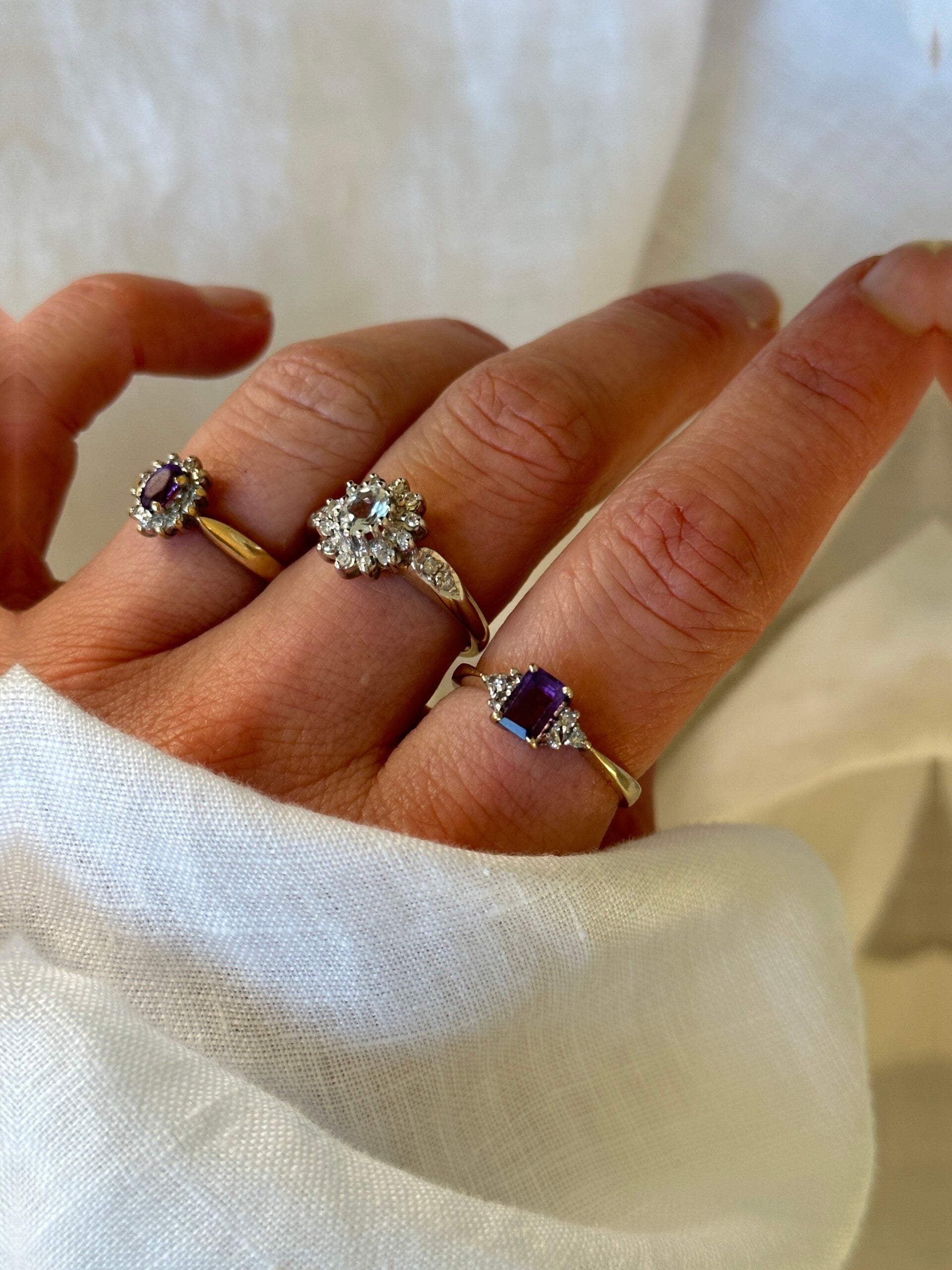 The ring features a 6 x 4mm oval emerald-cut amethyst and six round-cut diamonds. A forever treasure.