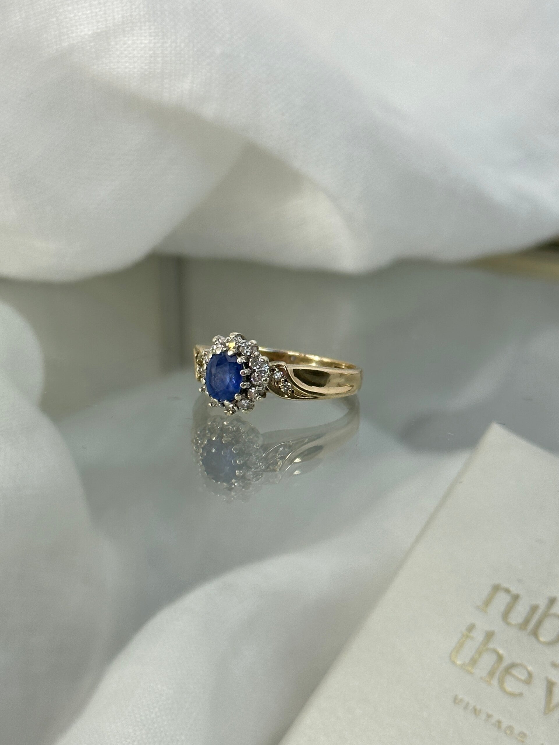 The Sapphire & Diamond Cluster Ring is just incredible! She is made of 9-carat gold. The ring features a 5 x 4mm oval blue sapphire and a cluster of twelve round diamonds, with two round diamonds on each shoulder of the ring.