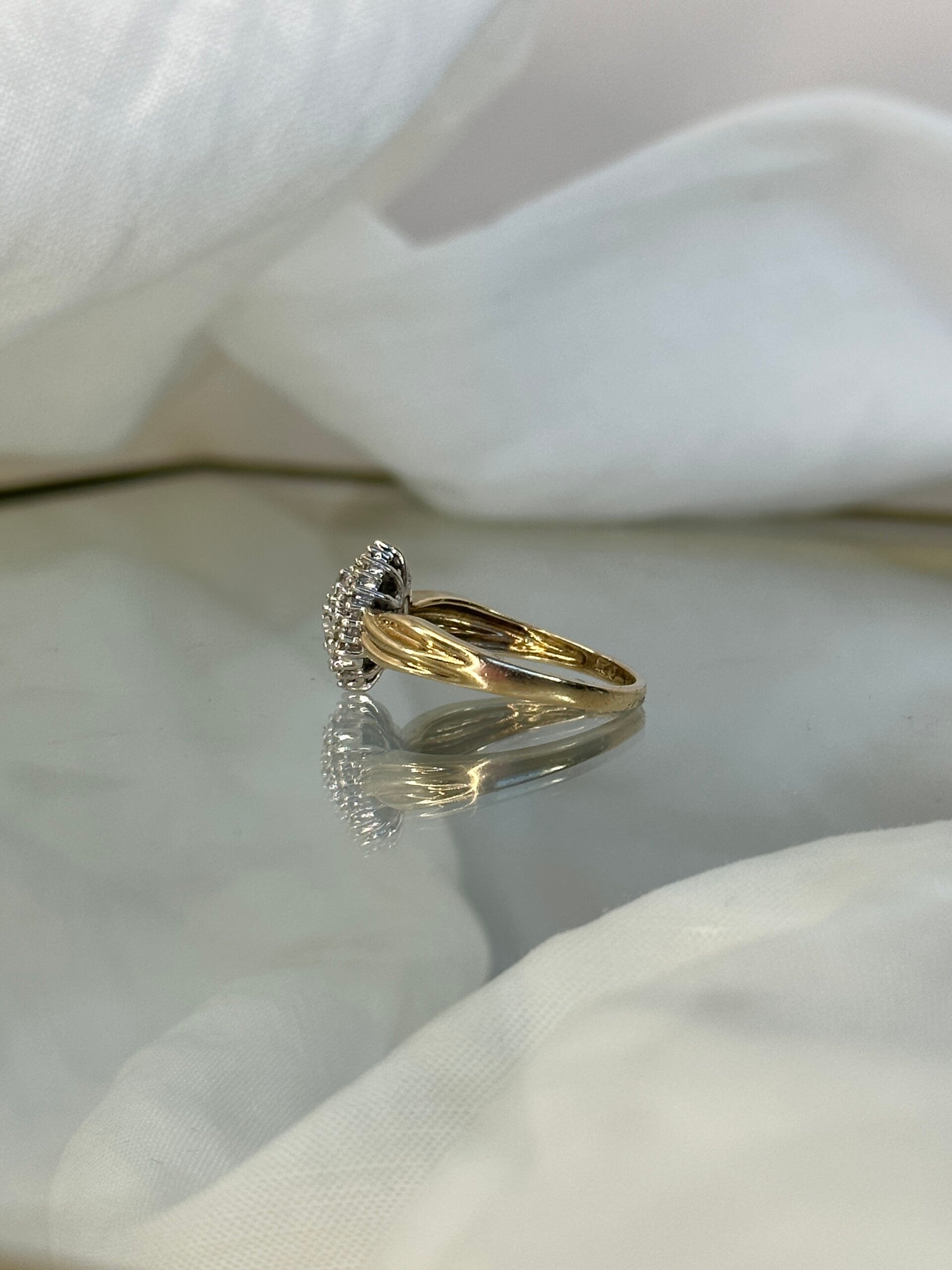 The face of the ring measures 11 x 9mm wide and features twenty-one round-cut, and sixteen baguette-cut diamonds. Total diamond weight of 0.25cts.