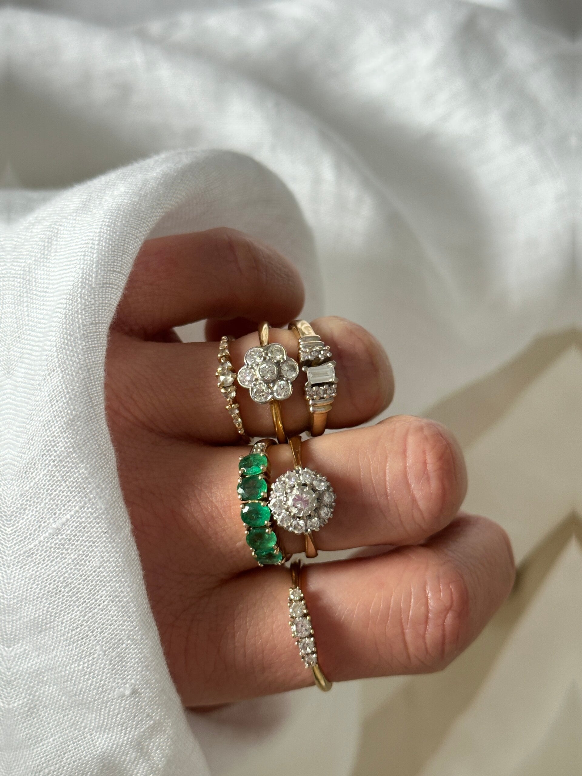 This ring features five 4 × 3 mm oval emeralds, accented by two small round diamonds on each shoulder. We are completely in love!