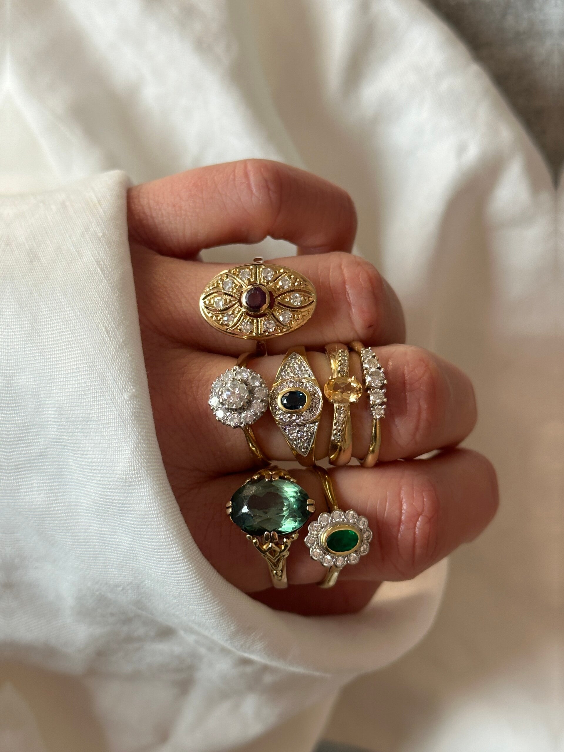 The Sapphire & Diamond Cluster Ring is just incredible! She is made of 18-carat gold inlaid with a beautiful 3 by 4mm oval Sapphire gemstone, surrounded by six tiny sparkling diamonds set in a illusion setting. There are two tiny diamonds on both shoulders of the ring. A classic treasure to love forever.