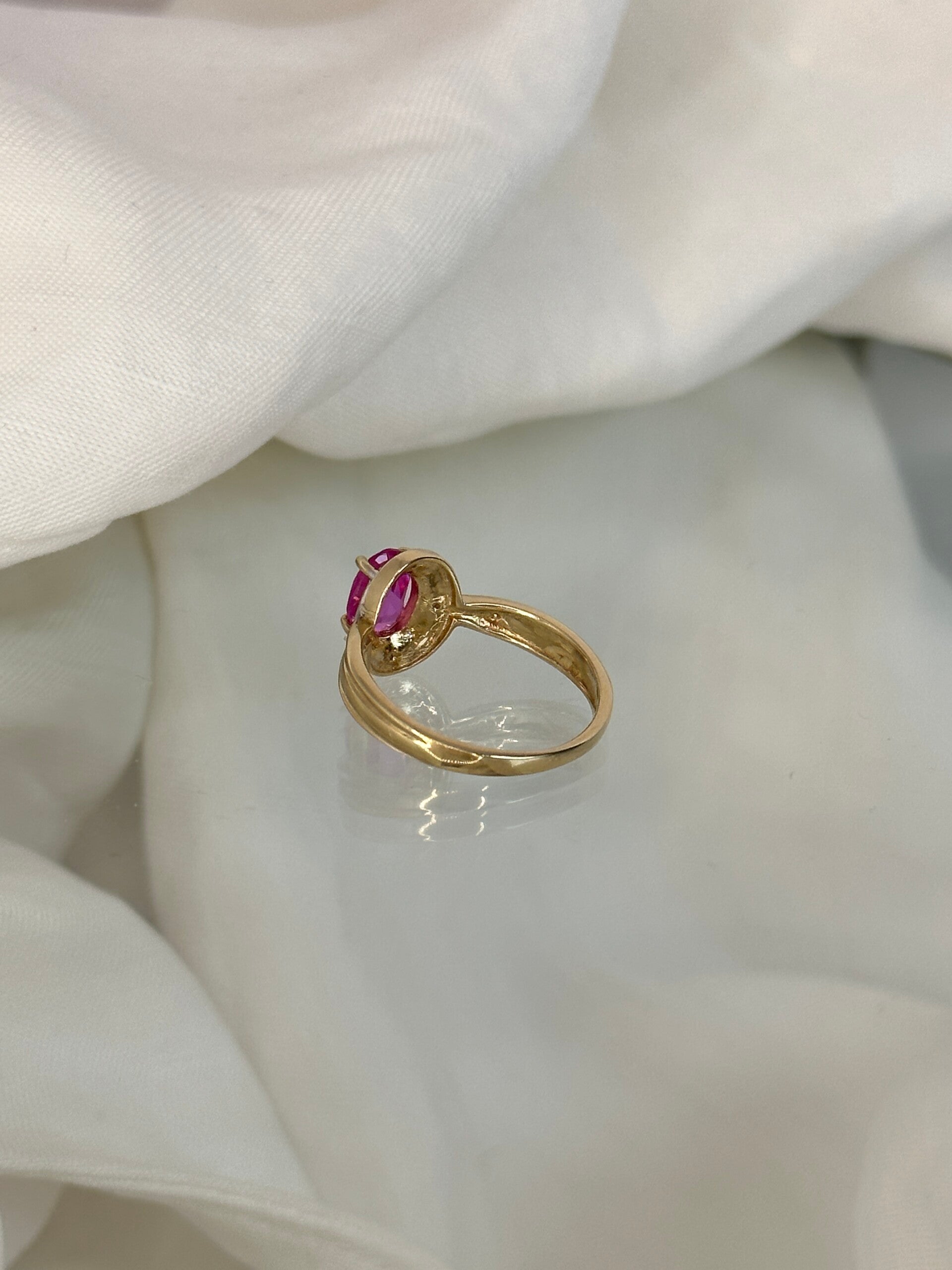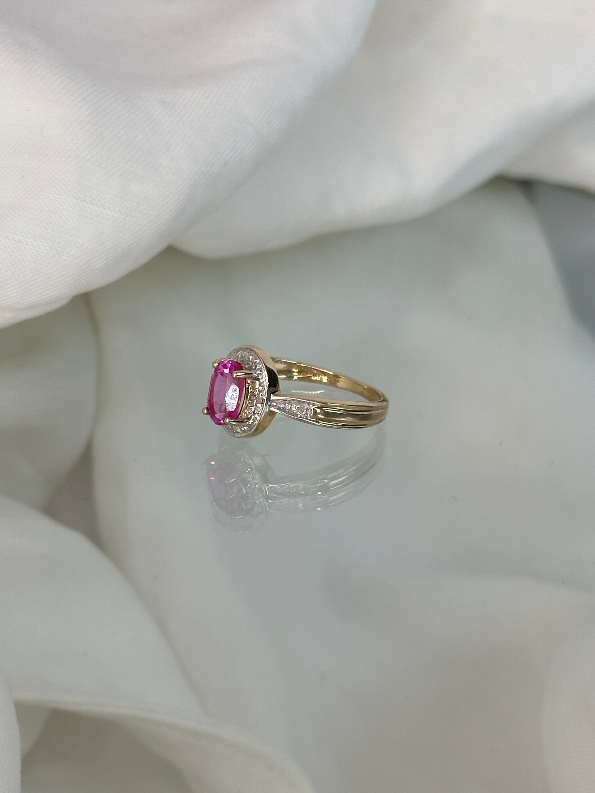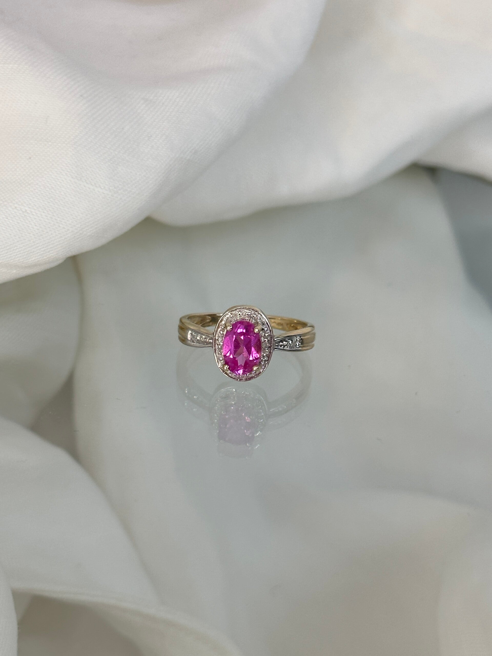 This ring features an oval pink Sapphire. The Sapphire measures 6 x 5mm and is surrounded by four tiny diamonds set in an illusion setting.