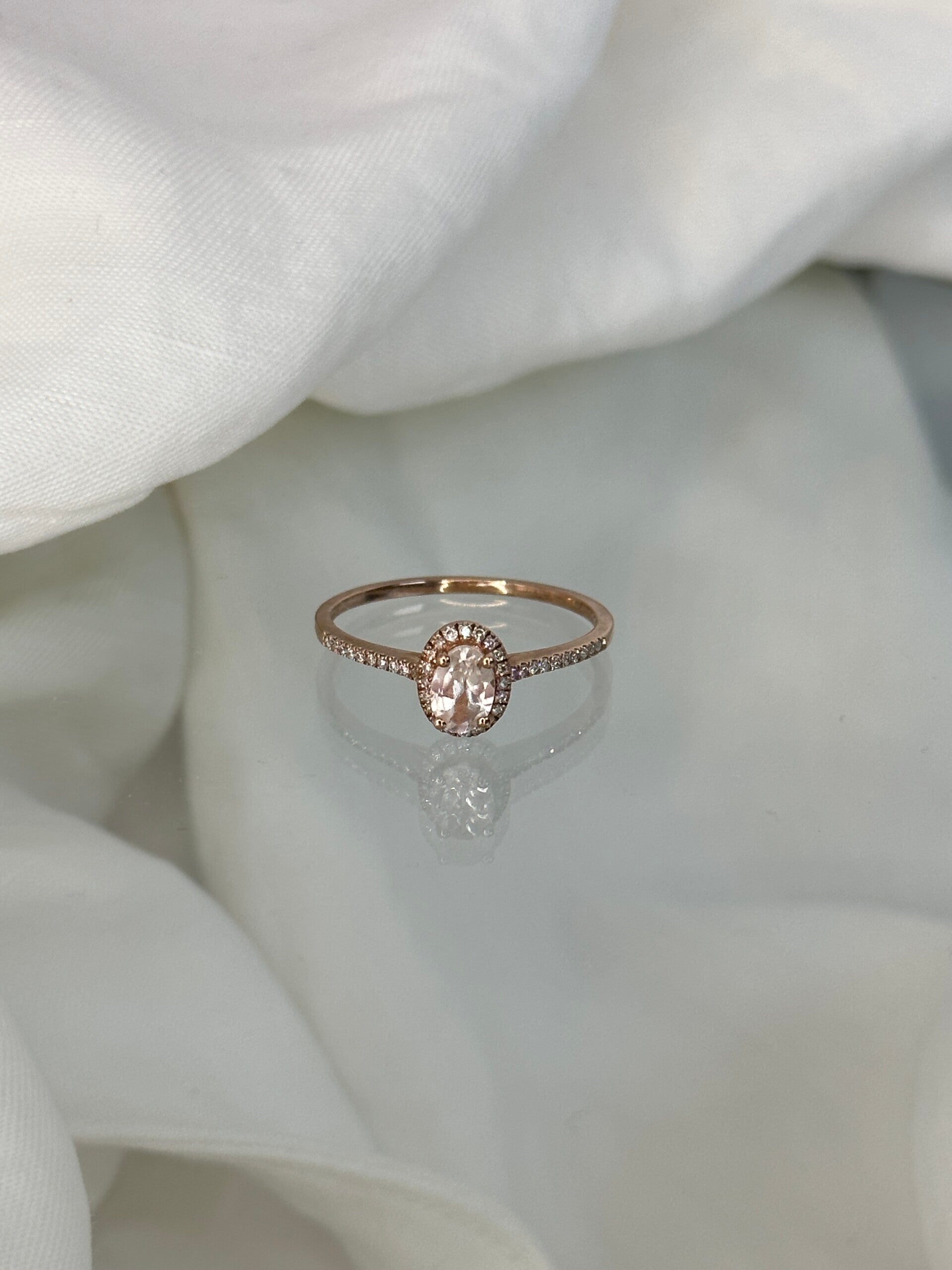 The ring features a 6 x 4mm oval morganite and a halo of 20 tiny diamonds. There are ten tiny diamonds on each shoulder of the ring.