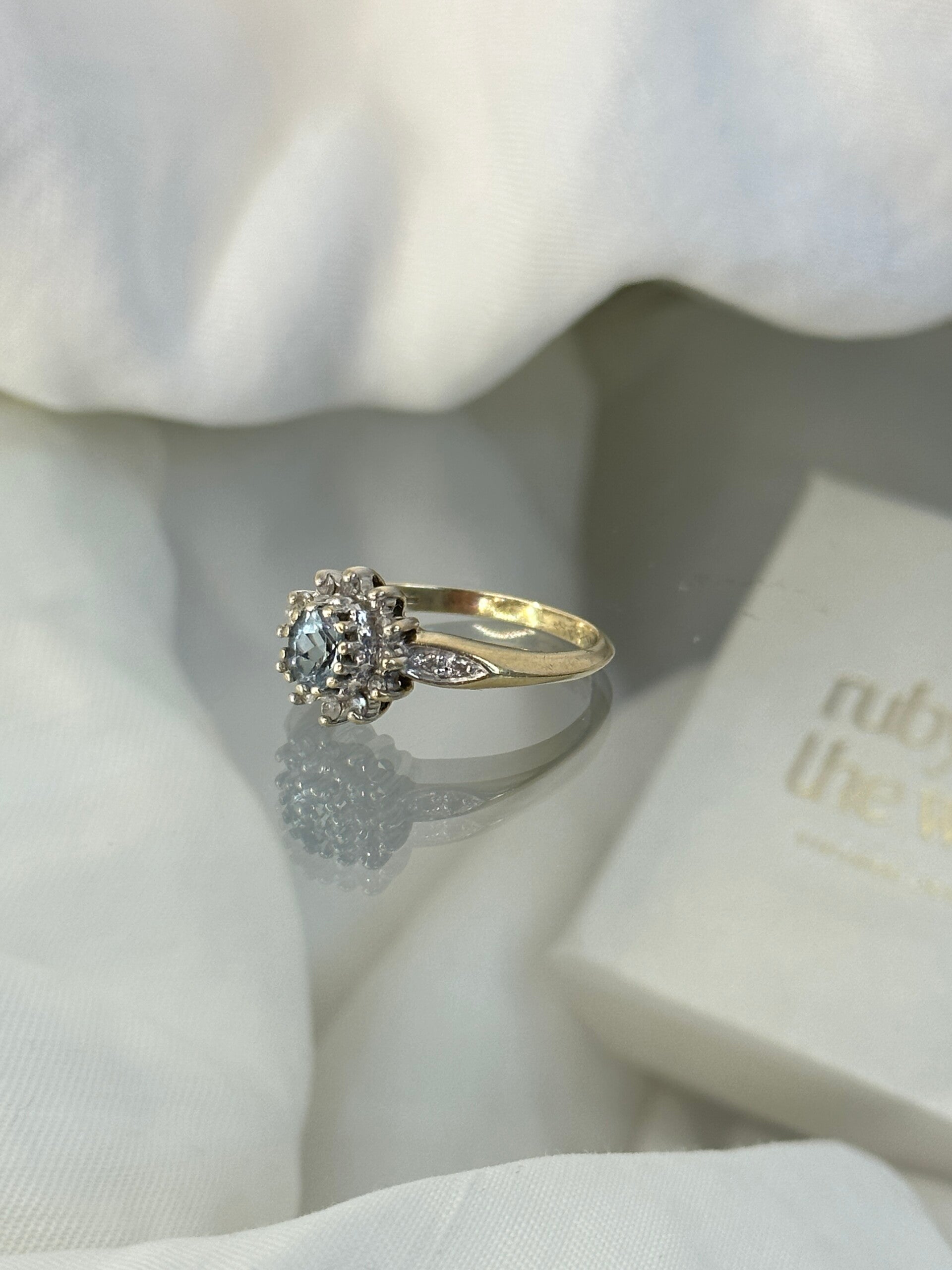 The ring features a 5.5 x 4mm aquamarine and a cluster of twelve round diamonds with two round diamonds on each shoulder of the ring. Total diamond weight 0.15ct.