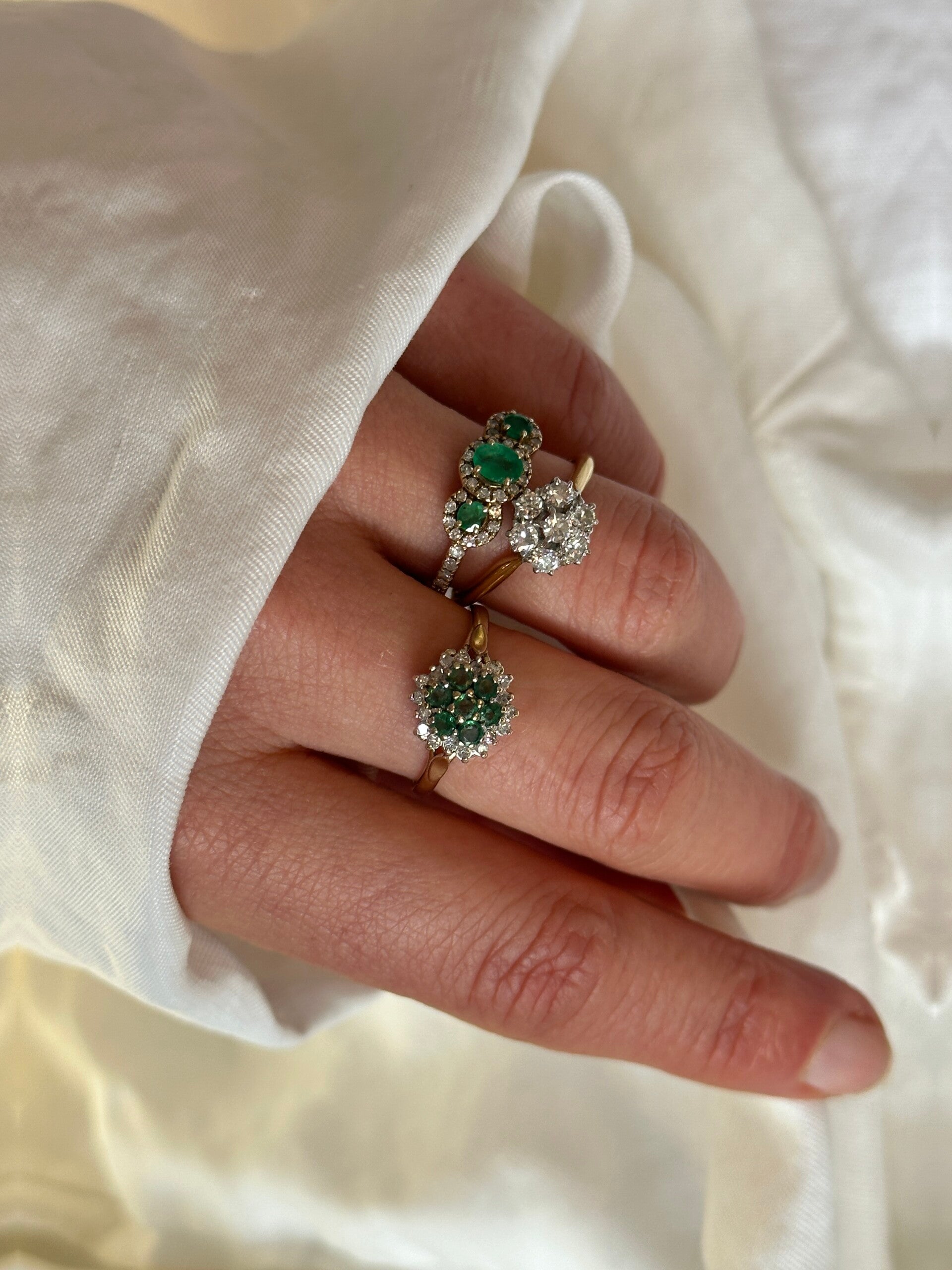 The face of the ring measures 10mm wide and features seven beautiful round-cut emeralds with a cluster of eighteen round diamonds.