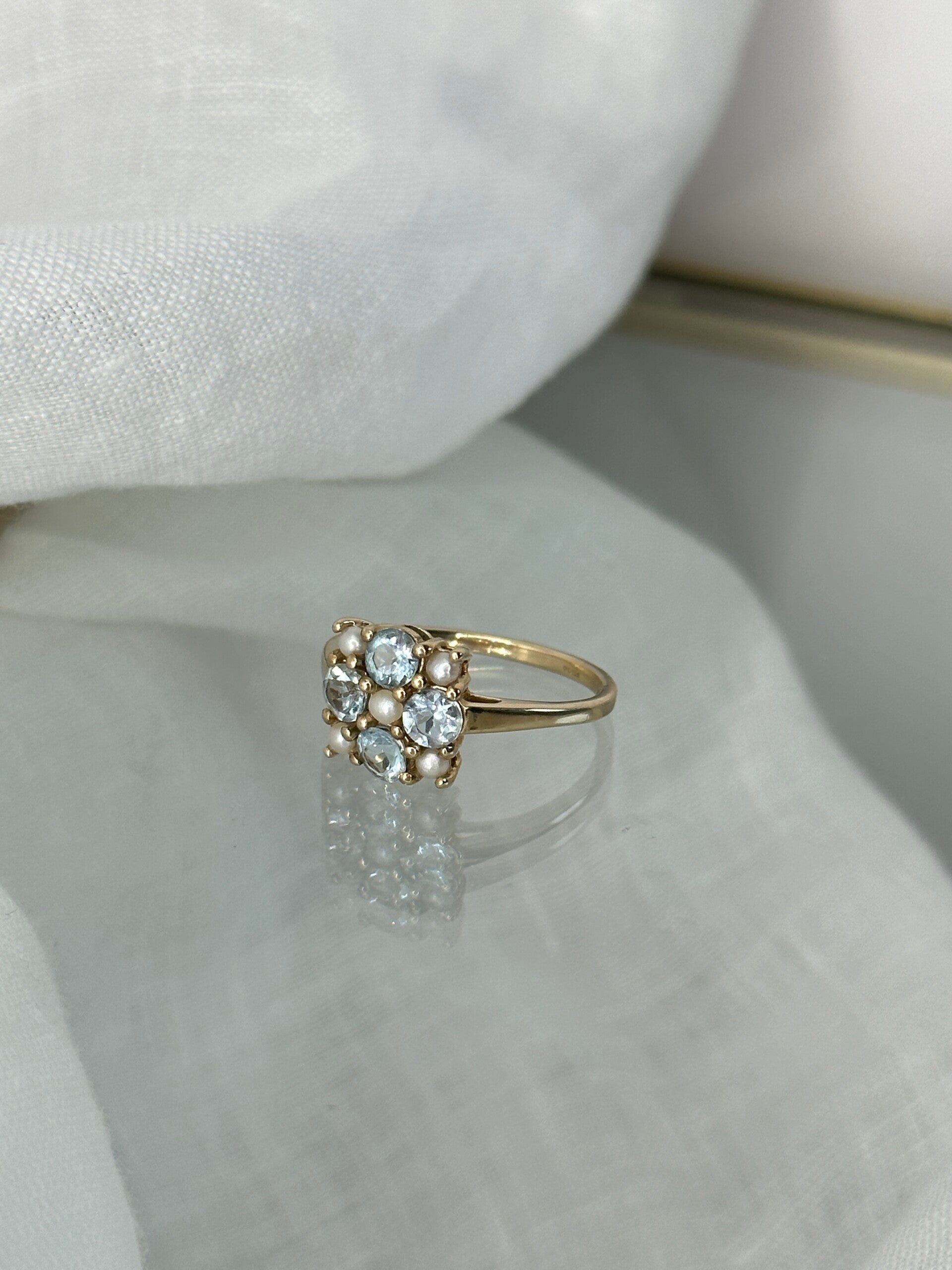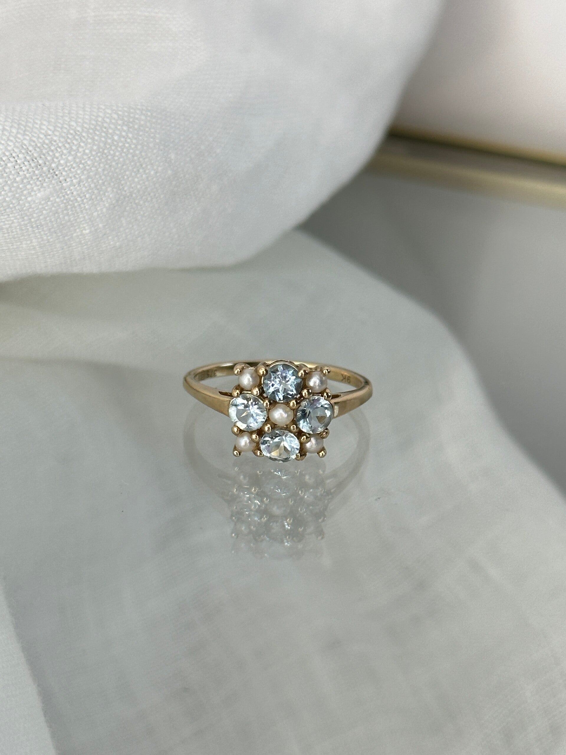 The face of the ring measures 10 x 10mm and features four round aquamarines and five pearls.